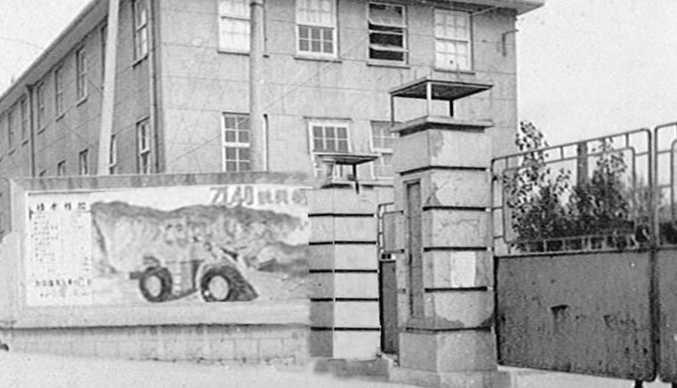 厂领导与地区机械工业公司领导在厂区合影(后排左起:张玉廷、尚志强、王志中、王成吉,前排左一:密福昌)。