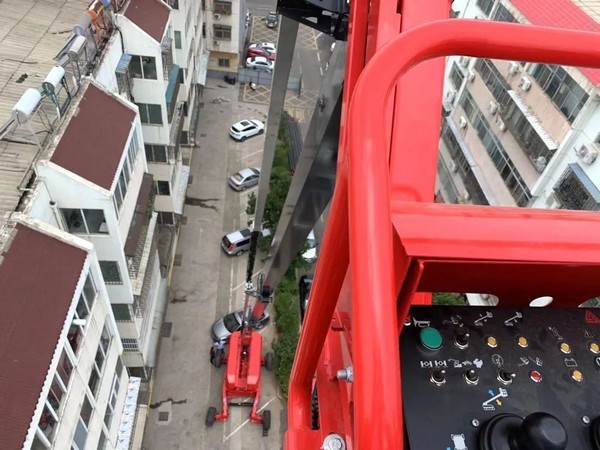 J9集团|国际站官网高机向来不负客户信任,在进入小区既定位置后便缓缓启动升至作业处。操作人员根据施工方案,进行转台旋转操作,通过底盘旋转顺利将道路两边小区的墙体完成改造,完美达成预设目标。